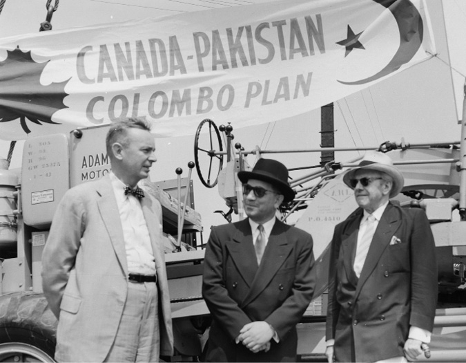 Cavell was a genius at promotion. Pakistani High Commissioner M. O. Ali Baig, Deputy Under-Secretary R. M. MacDonnell, and Nik Cavell are shown in front of a heavy grader being shipped to Pakistan for the Warsak Hydro-Electric and Irrigation Project. (Source: Editorial Associates, LAC e008303260)
