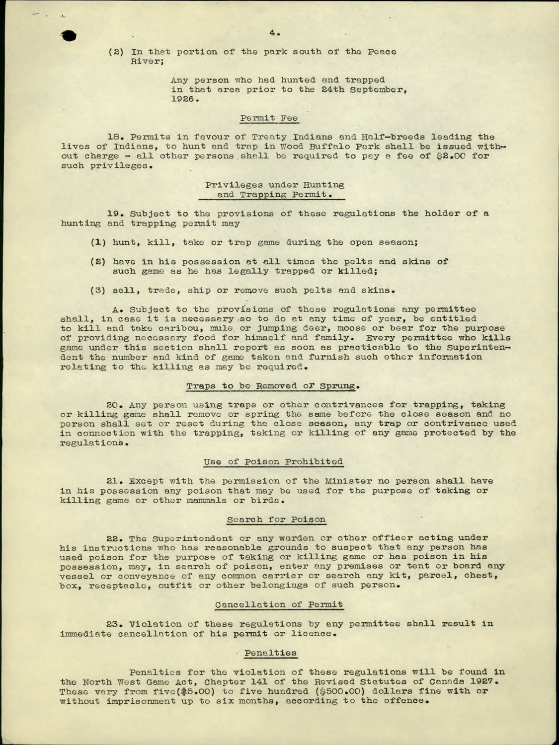 Permits in favour of Treaty Indians and Half-breeds leading the lives of Indians, to hunt and trap in Wood Buffalo Park shall be issued without charge – all other persons shall be required to pay a fee of $2.00 for such privileges.