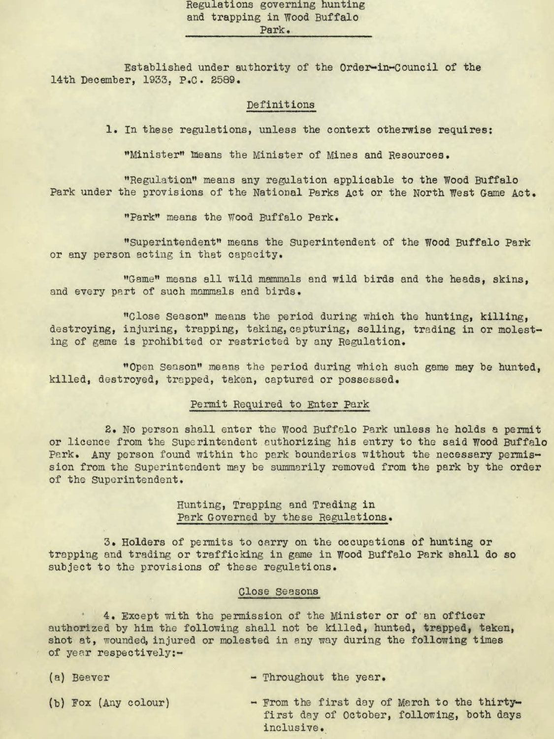 No person shall enter the Wood Buffalo Park unless he holds a permit or license from the Superintendent authorizing his entry to the said Wood Buffalo Park. Any person found within the park boundaries without the necessary permission from the Superintendent may be summarily removed from the park by the order of the Superintendent.