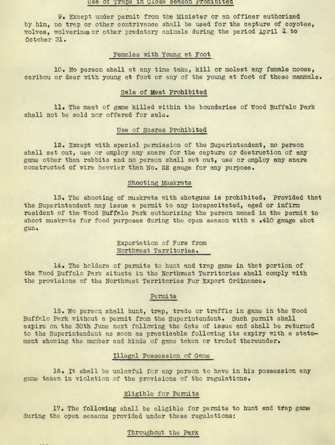 The shooting of muskrats with shotguns is prohibited. Provided that the Superintended may issue a permit to any incapacitated, aged or infirm resident of the Wood Buffalo Park authorizing the person named in the permit to shoot muskrats for food purposes during the open season with a .410 gauge shotgun.