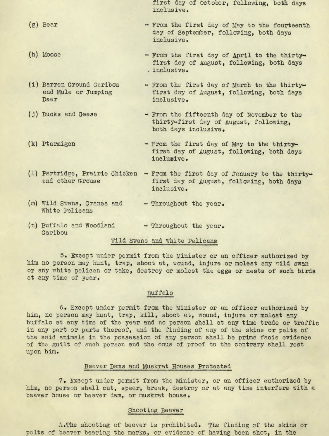 Except with the permission of the Minister or of an officer authorized by him the following shall not be killed, hunted, trapped, taken, shot at, wounded, injured or molested in any way during the following times of year respectively: -