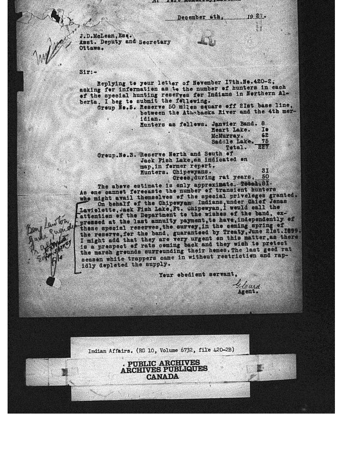 On behalf of the Chipewyan Indians, under Chief Jonas Laviolette, Jack Fish Lake, Ft. Chipewyan, I would call the attention of the Department to the wishes of the band, expressed at the last annuity payment, to have, independently of these special reserves, the survey in the coming spring of the reserve, for the band, guaranteed by the Treaty, June 21st.1899. I might add that they are very urgent on this matter, as there is a prospect of rats coming back and they wish to protect the marsh grounds surrounding their homes. The last good rat season white trappers came in without restriction and rapidly depleted supply.