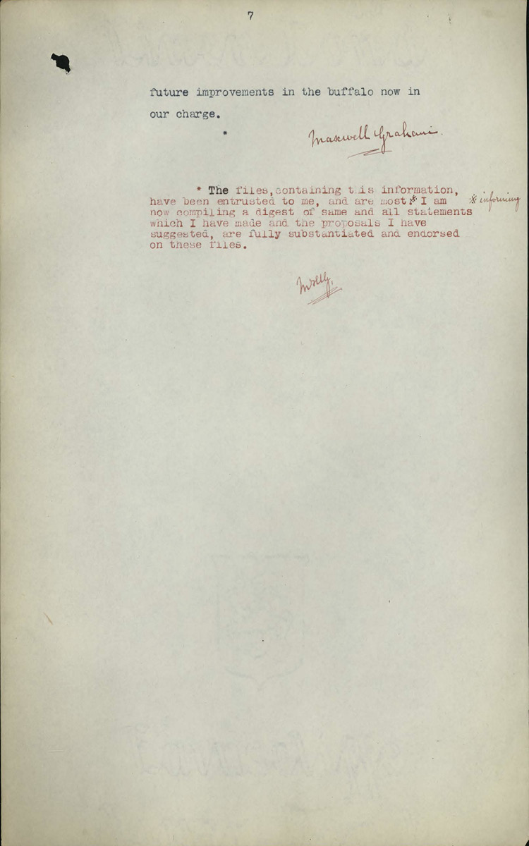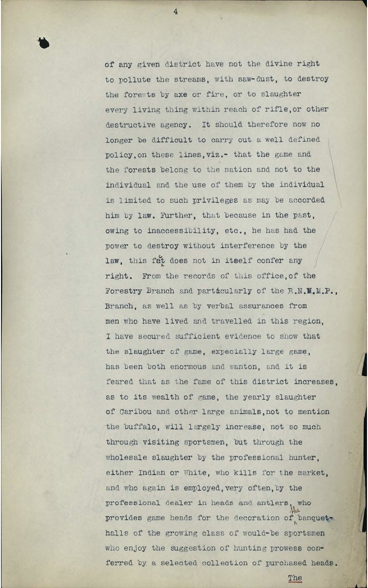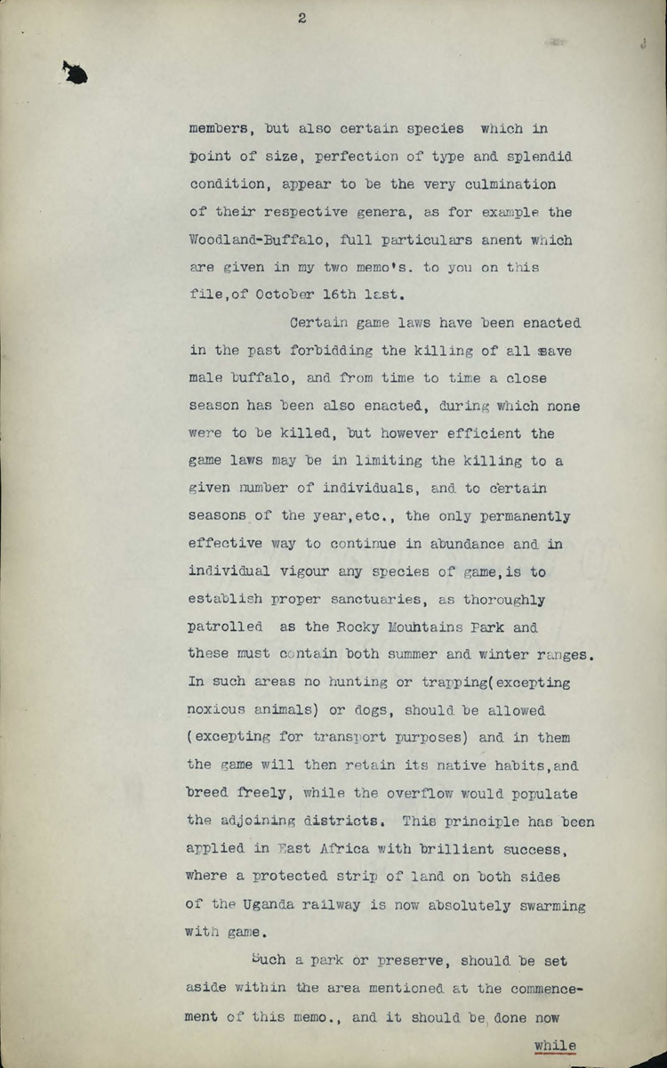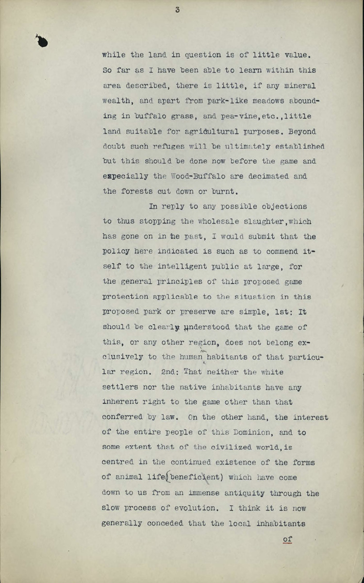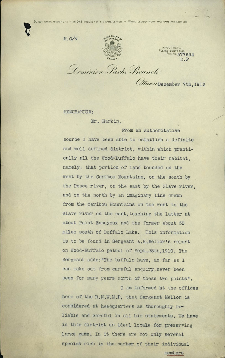 In conclusion I therefore suggest that this game Reserve, together with the proposed enclosed park, within the same, be given into the charge of this Branch, which is responsible for the care of the buffalo and large game in the present Dominion Parks, and therefore should properly control and administer the only source from which we may look for future improvements in the buffalo now in our charge.
