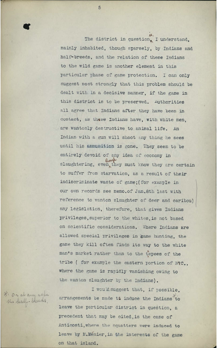 I would suggest that, if possible, arrangements be made to induce the Indians, or at any rate the half-breeds, to leave the particular district in question, a precedent that may be cited, is the case of Anticosti, where the squatters were induced to leave by M.Ménier, in the interests of the game on that island.