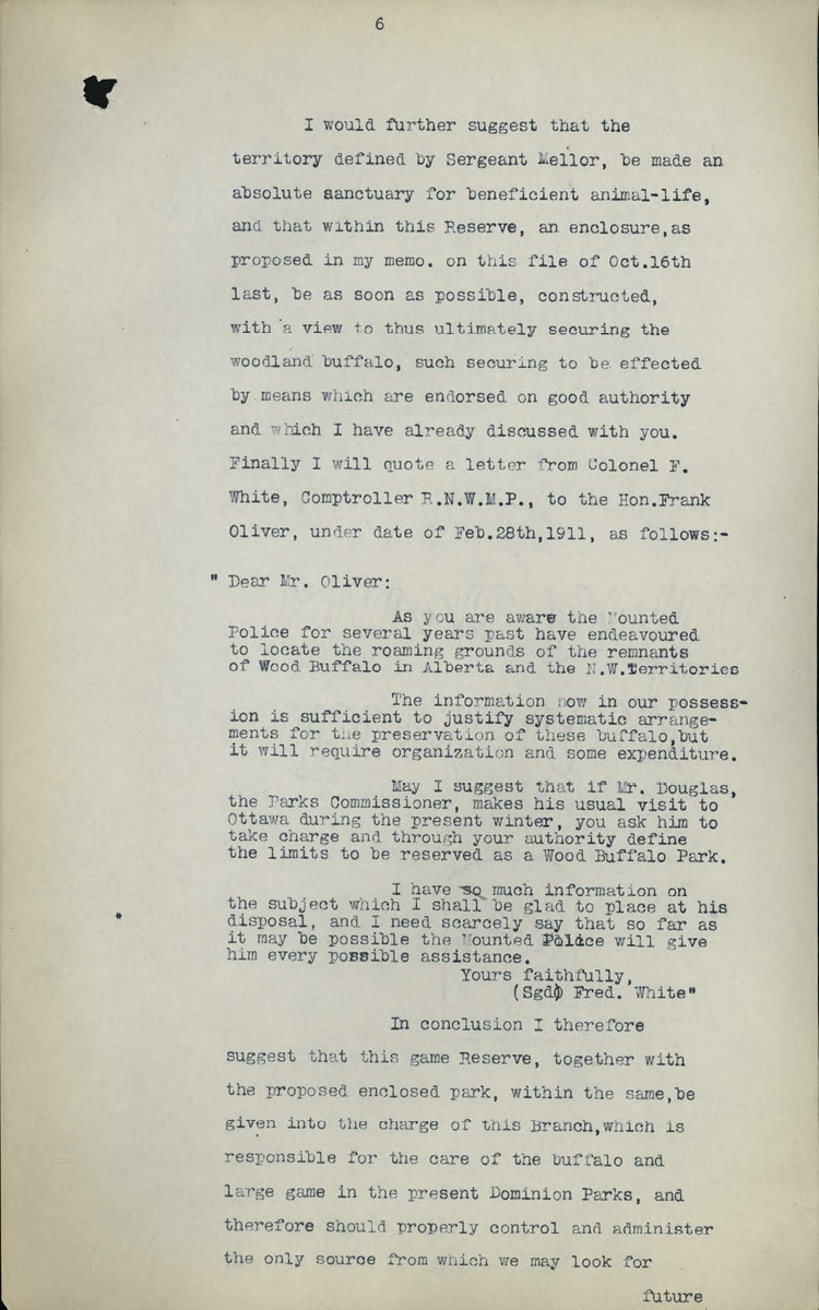 I would further suggest that the territory defined by Sergeant Mellor, be made an absolute sanctuary for beneficent animal-life, and that within this Reserve, an enclosure, as proposed in my memo. on this file of Oct.16th last, be as soon as possible, constructed, with a view to thus ultimately securing the woodland buffalo, such securing to be effected by means which are endorsed on good authority and which I have already discussed with you. Finally I will quote a letter from Colonel F. White, Comptroller R.N.W.M.P., to the Hon.Frank Oliver, under date of Feb 28th, 1911, as follows: -