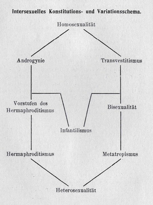 This last point raises another problem of terminology: Hirschfeld also used the word “intersexuality” in a very different way than we would today. What he meant can most easily be demonstrated in a graphic produced for his article on the intersexual constitution: